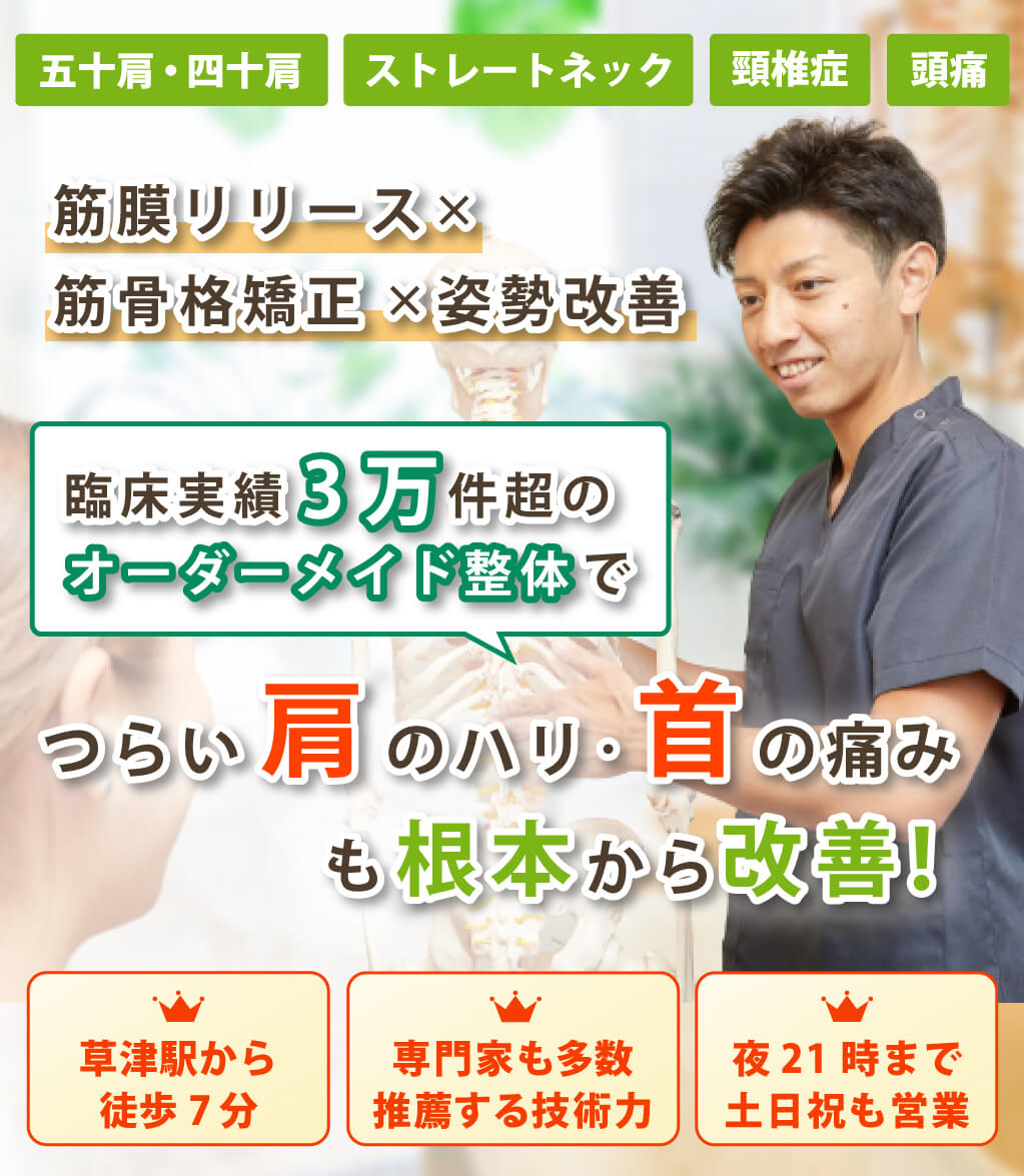 五十肩・四十肩、ストレートネック、頸椎症、頸椎ヘルニア、頭痛など首の痛みや肩こりの施術経験が豊富な整体院です。施術して終わりではなく、その後の自宅でできるセルフストレッチや生活習慣の指導もいたします。